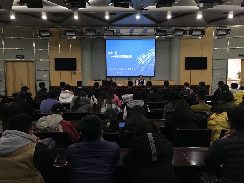 讲座共有两场,上午九点,伴随着热烈地掌声,京博商校副校长孔祥令老师开始了精彩的演讲。孔老师提出,成功要求之一是“不争”。以郭德纲的事例点出不与员工争,以腾讯的例子点出不与客户争。孔老师以各种风趣幽默的故事讲出其中的道理。下午三点,山东省人社厅董廷杰处长首先结合自身创业经历,从“创业三问”这个主题,为同学们阐述了就业创业及为人处世等方面的重要性。董处长指出,面对复杂的社会环境和激烈地就业形势,同学们要时刻做好准备,不仅要准备好个人技术,更要准备好迎接社会挑战的心态。他还强调,行为养成习惯,习惯造就性格,性格决定命运,同学们应养成良好的习惯,才能培养出突出的个人能力。